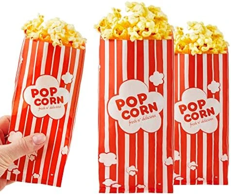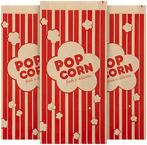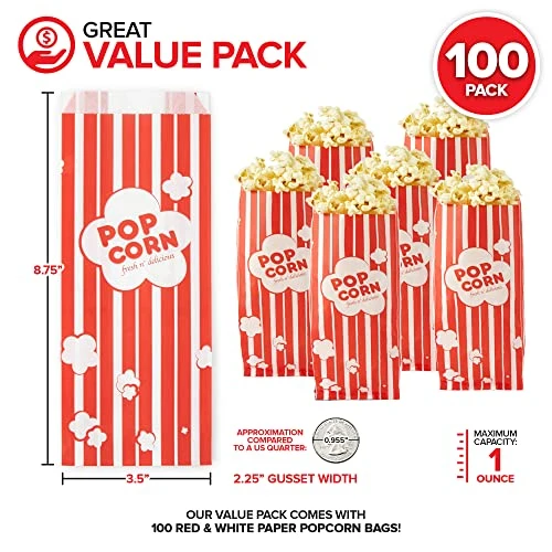 - Great Value Pack: Our value pack comes with 100 red and white pop-corn bags with a 1-ounce capacity each. Measures approximately 3.5” Width x 2.25” Gusset Width x 8.75” Height.