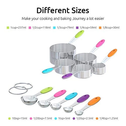 - [No more guesswork] Easy to grab the right size with the colorful handles as 34.37% reviews reflect. Each cup has clearly engraved marking to show its “ml” and “cup” size, and you can easily identify the cup scale according to the color of the handle. No more guess in kitchen!