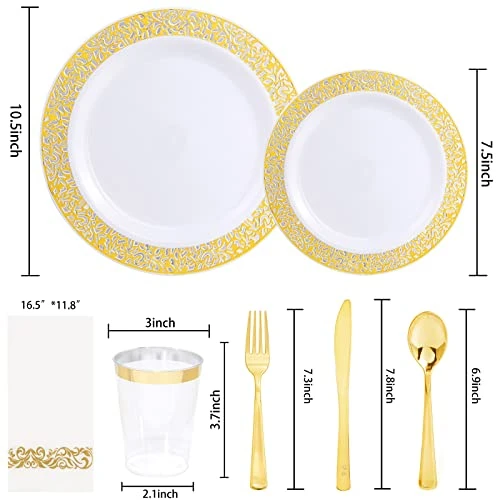 - ELEGANT DESIGN: The guest napkins boast a classy, floral design, while the plates and gold plastic cups are all enhanced with gold rims, but take care of the lace detail is a cut out not a solid part of the plate.