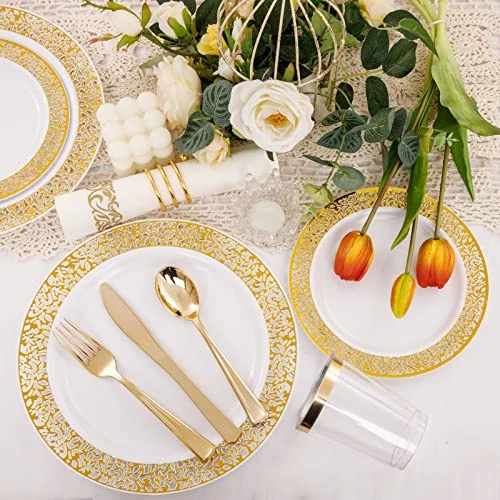 - PERFECT FOR ANY OCCASION: Gold plates with Hand Towel Napkin will sparkle as you wine and dine your guests at Halloween, Christmas, Thanksgiving, Birthday party, Graduations, Anniversary, Weddings or any occasions.