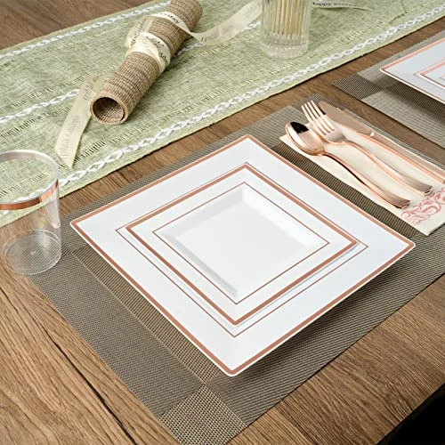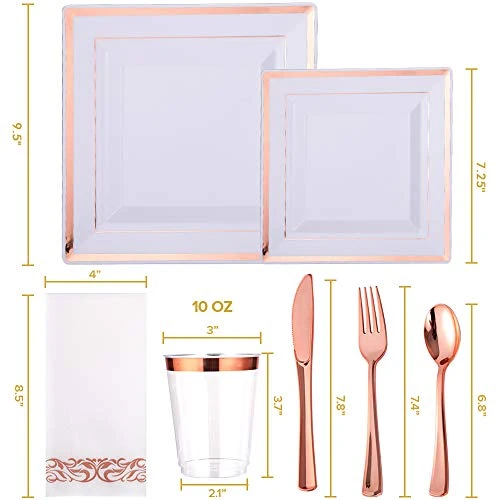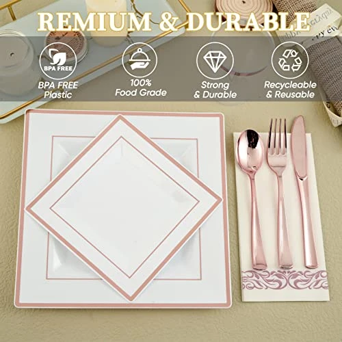 - 25 Premium Heavy Duty Disposable 9.5″ Square Dinner Plates And 25 7.25″ Square Salad Dessert Appetizer Plates – Disposable Plastic Rose Gold Silverware Set 25 Plastic Forks, 25 Plastic Spoons, 25 Plastic Knives