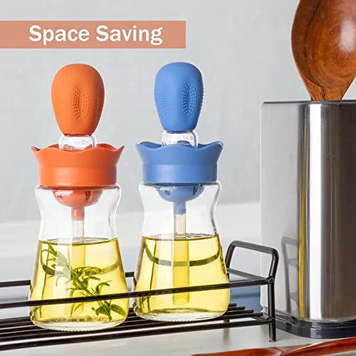 - 【Practical 2-in-1 Design】All-new 2-in-1 silicone oil basting brush with an oil dispenser makes spray oil easy and quantitative. The oil brush spot is composed of a silicone pipet head, AS transparent oil storage space with measurement scales, T shape silicone brush, a PP filter funnel, a PE straw, and a glass bottle. Just squeeze the silicone pipet head you can baste oil easily.