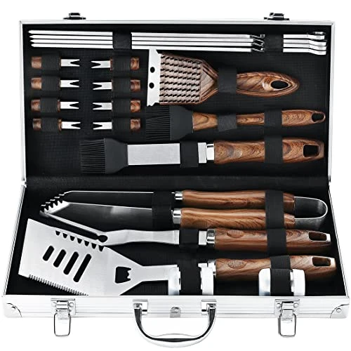 - Sleek-Stainless Finish Grill Tools – The bbq accessories are made of premium stainless steel and wood grain coating plastic that are heat-resistant and durable, making the grilling process safer and easier. All the bbq tools handles feature fingerprint design for a stable and comfortable grip.