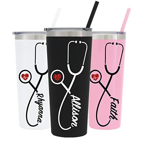 Our personalized tumblers make a great personalized gift for the people in your life who deserve something special. We use the highest quality outdoor vinyl to create the decal of your choice. Decal will last up to 3-5 years if tumbler is hand-washed, and the tumbler is a one-of-kind, unique gift. Our 20 oz tumblers are vacuum insulated stainless steel, so they keep drinks hot or cold for hours. Includes a straw and lid. Please note that tumblers may show some minor indications of being touched since they were handled during the customization process.