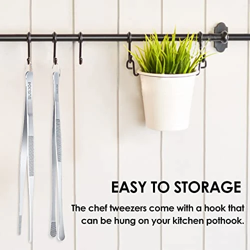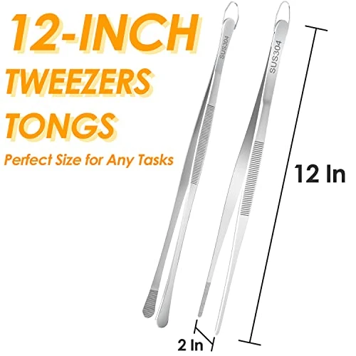 - EXTRA-LONG KITCHEN TWEEZERS: 12-Inch chef tweezers are long enough that grease splatters are reduced and keeps you away from any heat source while cooking. The long length also saves your energy when you pick up items.
