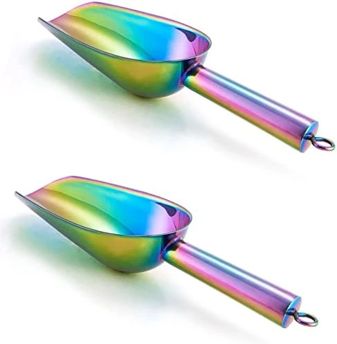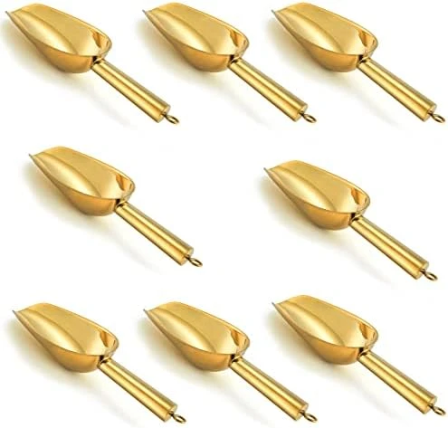 - 【2 PIECES, GOLD COLOR】Available in 2 pieces of 3oz, Dimension: 6.5″ L x 2.3″ W x 1.25″ H, 2 piece Set would meet your any needs to scoop dry food, ice cube, candy, coffee bean, popcorn, grains, Gold color is eye-catching enough and will match different styles of kitchen and multiple occasions such as bar, and buffet, party and garden