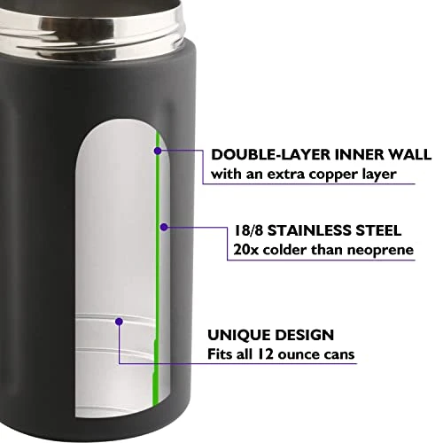 - 【EXCELLENT DOUBLE-LAYER INNER WALL DESIGN】High-quality stainless steel cans and bottle insulators, cans with slender double inner walls, can provide excellent thermal insulation performance, and can ensure that the beverages remain fresh for several hours. Finger grooves and portable size (3 inches * 6 inches) provide a more comfortable and firm grip! Keep the drink fresh and cold to the last drop.