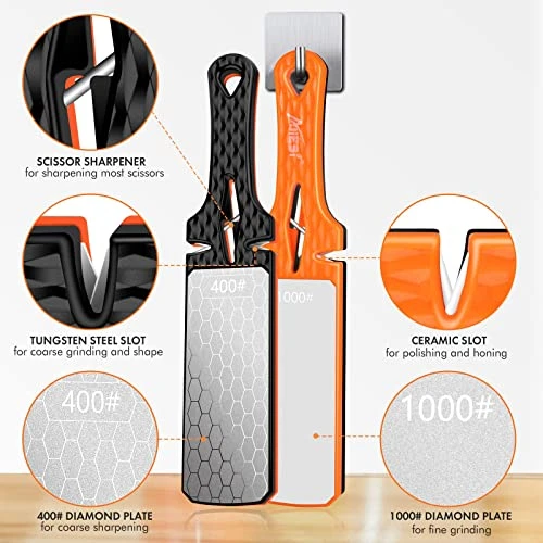 - 【VERSATILE 3 SHARPENING SLOTS, MORE THAN SHARPENING STONE】 5-in-1 kitchen knife sharpeners is also equipped with 3 grinding slots on the handle: ①Ceramic slot is for daily grinding(white); ②Tungsten steel one for sharpening blunt knives(silver); ③The middle one for scissors grinding. Solves all your different knife blade problems with this compact but mutifunctional Chef’s Kitchen Knife Accessories.