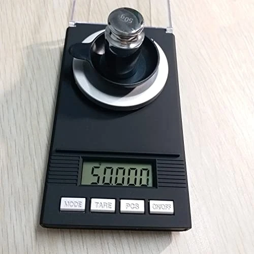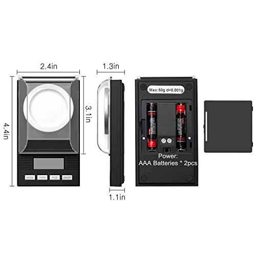 - Includings – 1 x 50g scale, 2 x AAA batteries, 1 x Tweezers, 1 x Calibration Weight, 1 x Weighing Pan