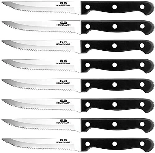 - MULTI-PURPOSE- The black handle steak knives set is great for BBQ weddings, dinners, parties. Homes & Kitchens perfect slicing & carving turkey, ham, brisket, fish, beef, and More. Add a refined and elegant style on the table. Our meat knife is sharp with flared handles, you can cut the delicious steak easily and elegantly!