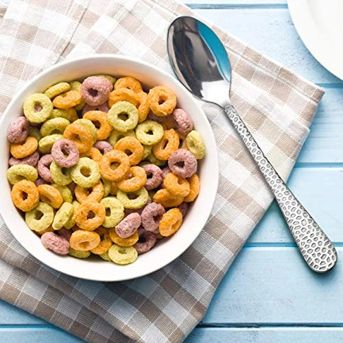 - ✅ PERFECT SIZE (^á´—^) – Customized mini size to fit toddler’s hand and mouth, Hammered pattern gives a shiny glow to catch toddlers’ attention, Proper thin fork tines make it easy for kids fork soft food by themselves, suggest for 24 months +