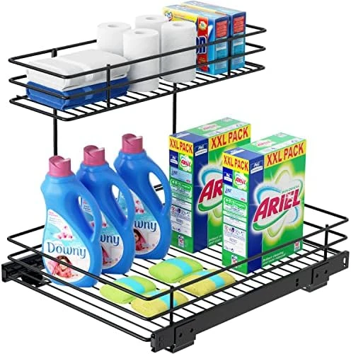 - 💒【SPACE-SAVING ORGANIZER】 Under sink sliding shelf with 2 tier sliding wire drawer, can solve your cabinet storage troubles, enlarge the limited sink space. A slide-out system like this one allows you easier access to all of the stuff you’re storing under the sink—and with tiered shelves, there’s room for all your stuff.