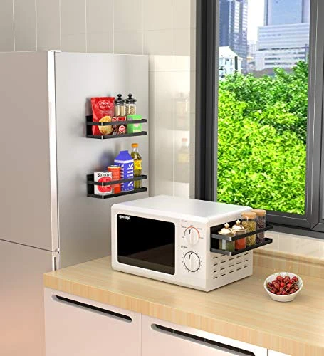 - WIDELY USED – This spice rack magnetic can attach soundly to the side of the refrigerator/ microwave/ stove/ BBQ smoker/ washer/ dryer to hold spices, salt shaker, olive oil, seasonings, tea, coffee syrup, sugar packets, kitchen timer, treats, and every little thing you used.