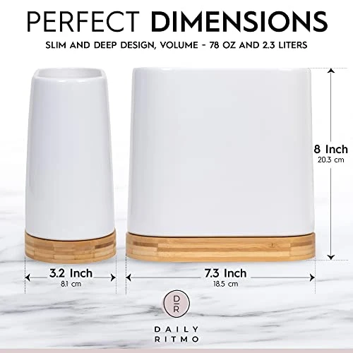 - ✅ Construction – Solid ceramic waterproof top. Bamboo bottom. Cylindrical oval space saving shape. Bamboo base is glued to the ceramic top. Cooking utensil holder with anti-slip bottom and anti-sliding pads. 3.25” Wide x 7.3” Long x 8” Heigh. Volume 78 ounces or 2.3 liters.