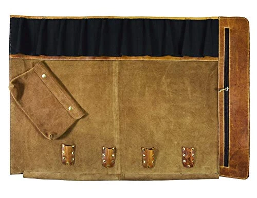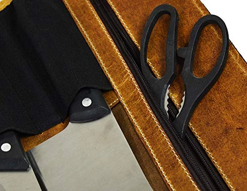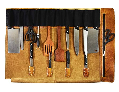 - There are 2 classy vintage buckles that form a tight roll, with stretchable knife pockets and 1 durable zipper pouch to keep the knives secure while you are on the go.