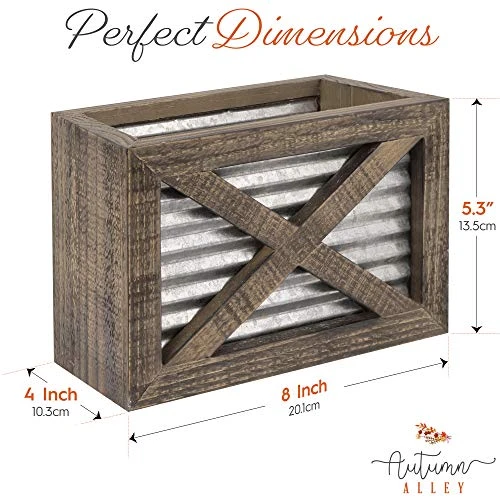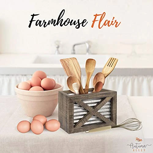 - RUSTIC KITCHEN DECOR: The corrugated galvanized metal and barn wood utensil caddy keeps your cooking utensils and accessories charmingly contained and easily accessible. Add this charming piece to your modern farmhouse kitchen for its functionality and good looks.
