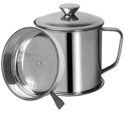 - 【Large Capacity】: 1.25 L / 42 oz capacity. This oil strainer pot helps us separate food from fat and reduce fat intake. Constructed with a curved comfortable handle that keeps your hand safe from hot grease, The lid can be closed without removing the strainer.