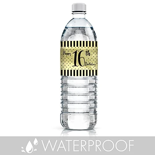 - Water bottles NOT included. 8.5″ x 2″ WATERPROOF LABELS fit standard and mini water bottles to make gold sweet 16 party favors.