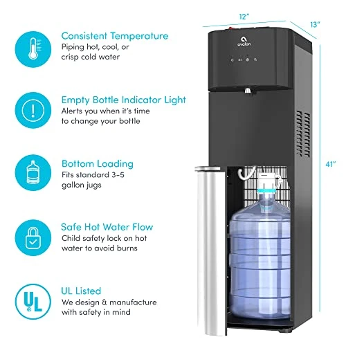 - BOTTOM LOADING WITH BIOGUARD: Our water cooler is bottom loading to eliminate the strain of lifting, reduce spills and is suitable for 3-5 gallon water bottles (BOTTLE NOT INCLUDED). High contact areas are also treated with BioGuard.