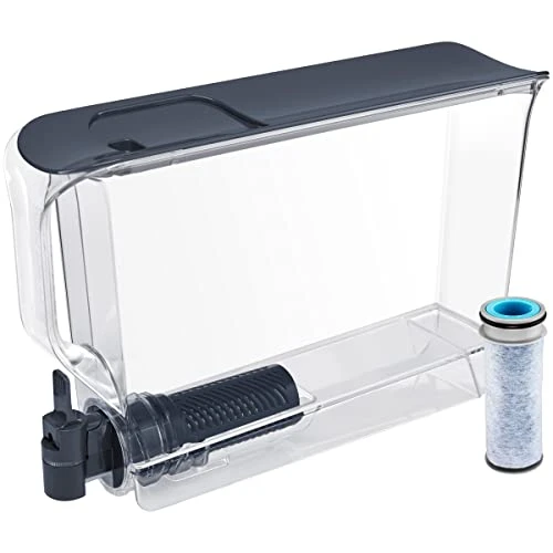 - This slim, space efficient filtered water dispenser fits perfectly on refrigerator shelves, features an easy locking lid and precision pour spigot; Height 10.25″; Width 4.41″; Length/Depth 15.97″; Weight 3 pounds