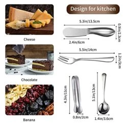 - 【Package Included】4 cheese spreader knives, length 5.3″/13.5cm, blade length: 2.3″/6cm . 4 scoops, Length: 5.1″/11cm, Spoon Width: 1.4″/3.6cm. 4 Forks, Length: 5.5″/14cm and 2 Mini Serving Tongs, Length: 4.3″/13cm. The best choice as a gift!