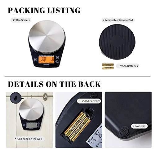 - ☕️ EASY-TO-READ DISPLAY: Large and backlit LCD screen, The coffee scale provides low battery and overload indication; Zero/Tare Function; Auto Shut-Off Function; 2 AAA batteries included.