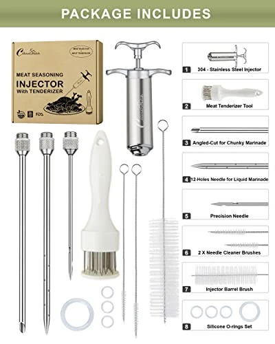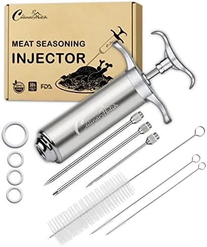- [VERSATILE MARINATING KIT WITH BONUS TENDERIZER]: In accordance to fulfills all your needs related to BBQ, Grill Smoking and any type of meat maniration. We are offering you a Meat Tenderizer Tool as a bonus along with 1 x Meat injector, 3 x Marinade Needles, 2 x small needle cleaning brush, 1 x Brush of injector barrel, 1 x Set of O-Rings. Our product comes with a Culinary Hutch branding Box and all accessories are perfectly fitted with an EVA cushion to avoid any collision or damage