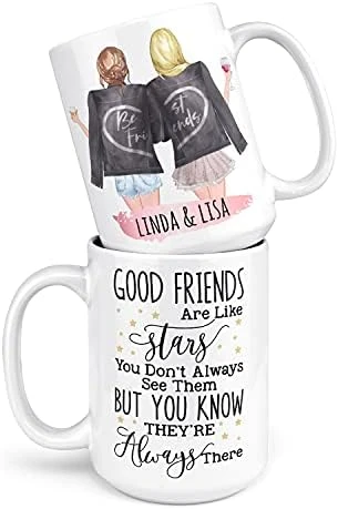 - RICH CUSTOMIZATION – ” Customization Now ” button let you create a remarkable mug that you and your best friends illustration printed on it. 6 SKIN – 60 HAIR COLORS & STYLES, 6 JACKET COLORS, 11 BOTTOMS & 10 DRINK OPTIONS.Also customizable names on the bottom. Surprise her w this special coffee mug. Forever friends!