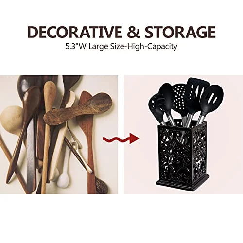 - Vintage Style & Durable Material: Graceful hollow pattern utensil holder kitchen organization looks classic and good ventilation. Kitchen utensil crock made of cast iron material which is Rustless, Fastness, Wear-resistant and Long service life.