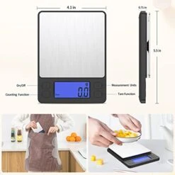 - [9 Weight Units]-The M button on the digital kitchen scale instantly converts between 9 units of measurements (g, oz, lb, tl, ml, ozt, dwt, ct, gn). LCD display allows you to read easily, perfect for cooking, baking, preparing coffee, weighing jewelry, food, powder, herbs.