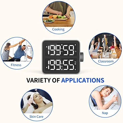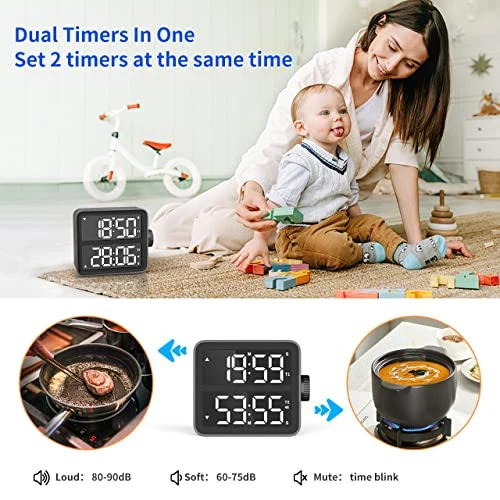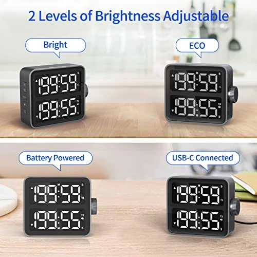 - 【Easy to Read & Set】Clear LED display with white numbers allow you easily see the time remaining. And you just need to turn the dial to set the time. Intuitive buttons to set volume and brightness levels, make the dual timer very easy to use. What you get: A Digital Timer, A USB-C Cable, 3*AAA Batteries and a User Manual