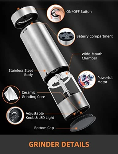 - Humanization Design: The 70ml (2.4 oz) large capacity spice container of electric pepper grinder eliminates frequencies to refill the spices. The wide mouth spice chamber of automatic salt and pepper grinder set lets you refill directly without any auxiliary tools.
