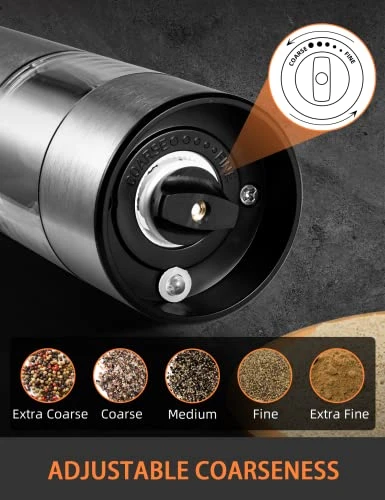 - Stepless Adjustable Coarseness: Twist the knob of salt pepper grinder set to set coarseness from coarse to extra-fine, suitable for most solid seasonings, such as sea salt, Pink Himalayan salt, black peppercorn, white pepper and so on.