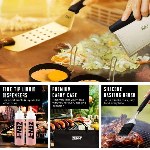 - Fourteen Piece Set Includes – 2 Oversized professional grade restaurant style stainless steel spatulas and 1 larger professional grade hamburger turner. Great for flipping burgers, veggies, pancakes as well as any other grill or griddle applications. 1 stainless steel chopper/scraper to scrape your griddle clean and handle all your food dicing needs. 2 leak-free premium fine tip bottles for your condiments and liquids like water or oil.