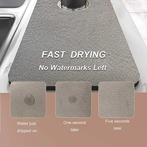 - Three layers of material, super absorbent: Our faucet mats are made of three materials, the material on the surface of the faucet mats is leather textured tech fleece, which can leak water down in seconds. The middle material is diatomaceous earth, which can instantly absorb water. The bottom material of the faucet mat is rubber non-slip bottom, not easy to use displacement, and will not leak.