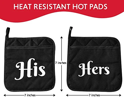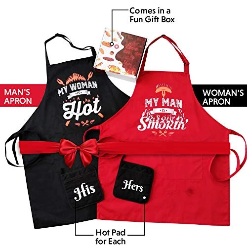 - Colorful and sturdy gift box makes gift-giving easy and gift-receiving exciting. The custom designed box holds both aprons and both his and hers pot holders. Even includes To/From space on the box so there’s no need for a tag or card.