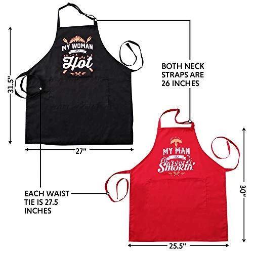 - ENCOURAGES COUPLE TIME – Whether spending time together in the kitchen or hanging out by the grill with your friends and family these funny aprons will not only protect your clothes, they’ll display your love for each other.
