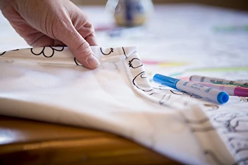 - PATENTED ADVANCED MATERIAL – This fabric is a Poly-cotton blend with a specialty backing that assures markers will not bleed through when coloring. It is a reusable, machine washable and wrinkle free fabric.
