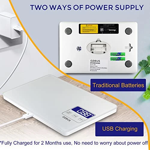 - 【 USB RECHARGEABLE & TEMPERED GLASS 】 This food kitchen scale is recharged by USB, fully charged one time could last 2 months even you use it every day, compared to others with batteries, it is more convenient and environmental. And the panel use tempered glasses, which is anti-print and so easy to clean.