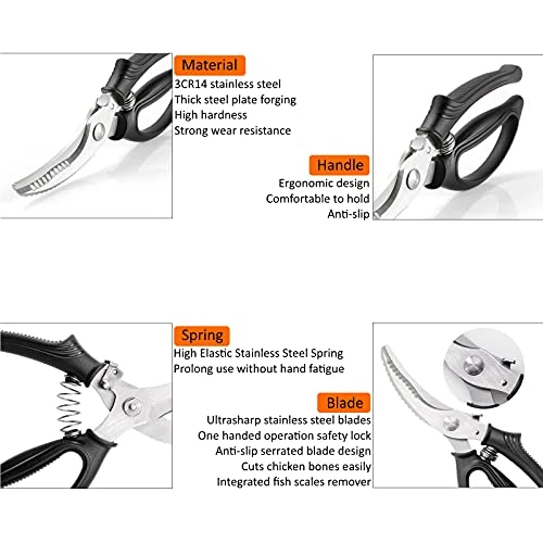 - ✂️ ERGONOMIC DESIGN: This kitchen scissors features an ergonomically designed anti-slip handle which is comfortable to hold. The handles are also spring loaded with stainless steel spring to prevent hand fatigue after prolong use.