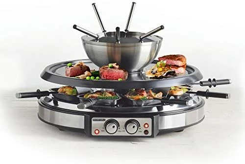 - All Accessories Included for Fondue & Grill- The fondue&grill combo includes one main grill plate for grilling, one fondue bowl for melting cheese or chocolate, 8 colored forks, 8 mini grill pans for keeping warm, 8 wooden spatulas. Providing as much as necessary for a fabulous fondue party. Perfect Gift for weddings, families and food lovers. They love it!