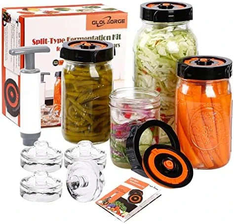 Glolaurge Fermentation Kit For Wide Mouth Mason Jars, 4 Pack Split-Type Fermenting Lids With 4 Weights And 1 Pump, Fermenter Starter Kit For Sauerkraut, Kimchi, Pickles, Fermented Vegetable
