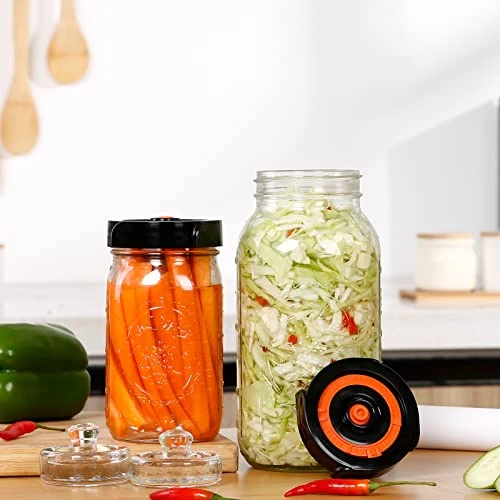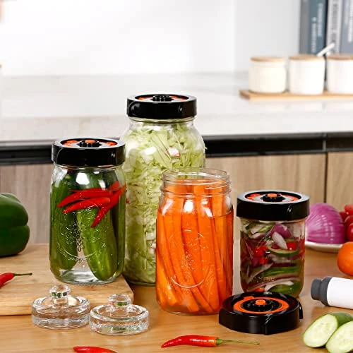 - 100% Satisfaction Guarantee: Each set has four lids, which are compatible with the wide mouth bottle you already have, four gravity rocks, a vacuum pump and a detailed instruction manual.Our fermenting lids for wide mouth mason jars supports our manufacturer’s 30 day money back guarantee and 1 year free replacement guarantee