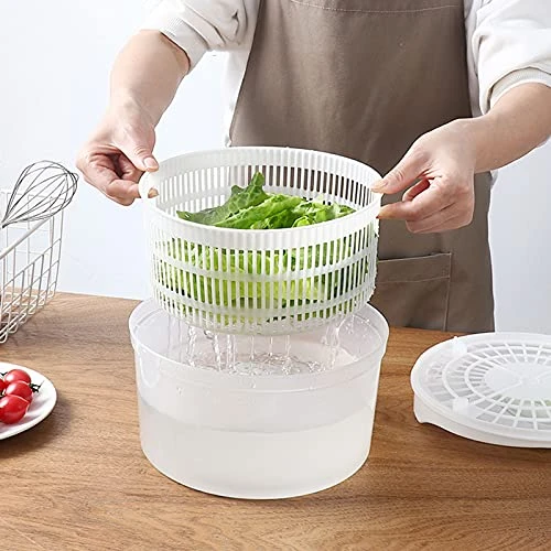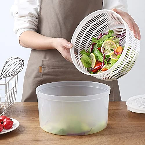 Use this salad spinner to easily make the most delicious salad; you will get completely dried vegetables, fruits, lettuce. Safe and easy to operate, let your children participate in your healthy diet. The unique large handle design makes it easy to rotate and clean fruits, vegetables and salads. Make cooking and kitchen life easier.The large capacity salad bowl is enough to hold the water leached from the vegetables, can dry the excess water on the vegetables.