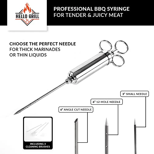 Hello Grill Meat Injector Syringe Kit – 3 Professional BBQ Injector Needles – Metal Marinade Injector – Meat Injectors For Smoking – Injection Syringe