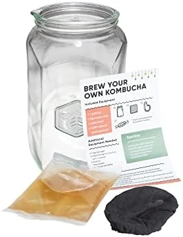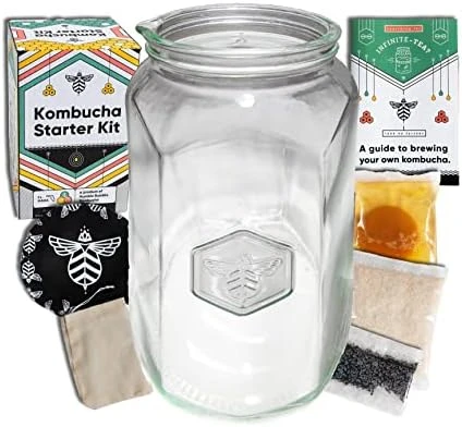 - CUSTOM KOMBUCHA JAR – Our proprietary Kombucha Jar is designed specifically for making kombucha at home, complete with 1 gallon & 2 cup volume markers, a pour spout lip, a bee-printed elastic cloth cover and instructions for brewing your own kombucha. This equipment makes it easier than ever to ferment and bottle your homebrewed booch