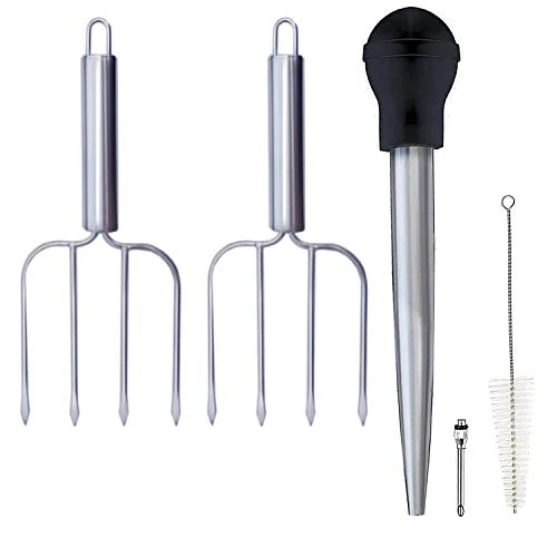 - FEATURES&EASY TO CLEAN: Turkey Baster,Large capacity bulb and tip are removable,Can be easily cleaned.- Stretchy.stays cool the touch.With Ergonomic-is comfortable to hold from any angle. Meat Fork, Stainless Steel body ensures that there is no rust formation. and Will Not Bend or Break. dishwasher safe
