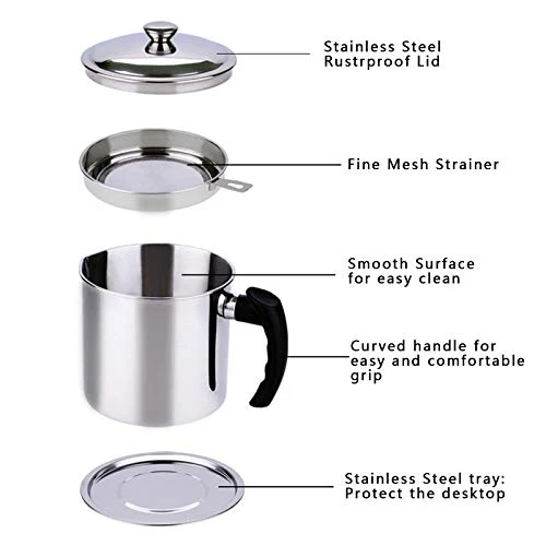 - โ๏ธFunctional: The Oil Filter comes with a wide mouth filter for easily filling. Wait till the oil complete cools down before put them into the fridge for the next use.This pot is a good container for storage the leftover oil. When there is no oil in them, it is also a good bowl for storing others foods.