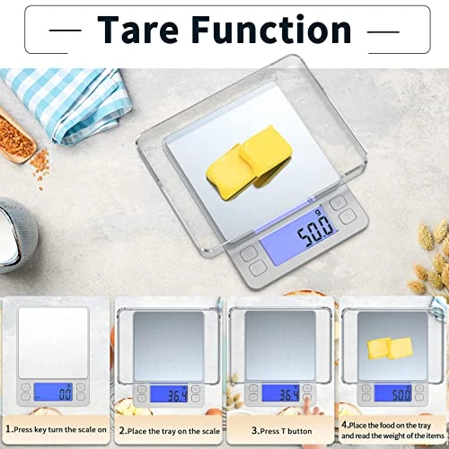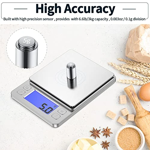 - ใAccurate Measurementใ This kitchen scale uses high-precision sensors, weighing range from 0.1g to 3000g, which can provide accurate measurement and real-time reading