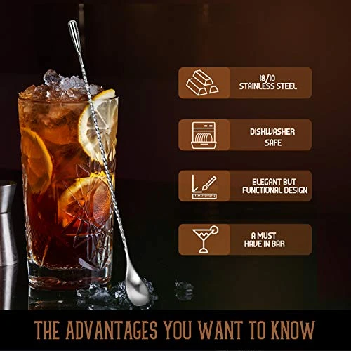 - PROFESSIONAL DESIGNS – ESPECIALLY THE FUNCTIONAL LENGTH. At 12 inches it has the ideal length for stirring drinks in taller glasses. Easily reaches the bottom of any cocktail shaker and mixing glass. The twist of the spoon makes it easier to grip and enhance the mixing strength while the striking teardrop design will accent your bartending skills.